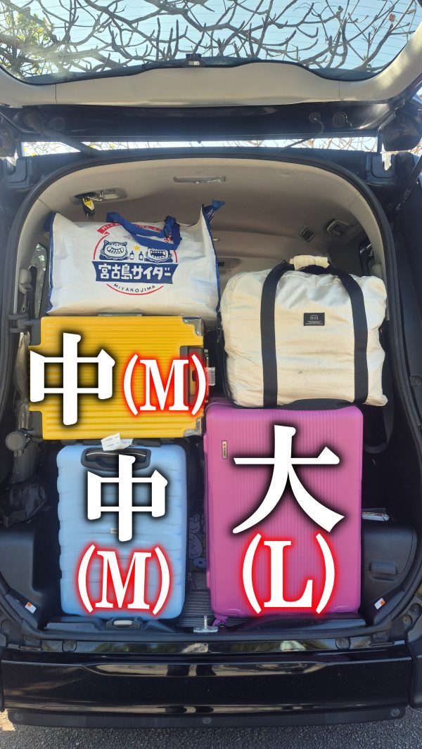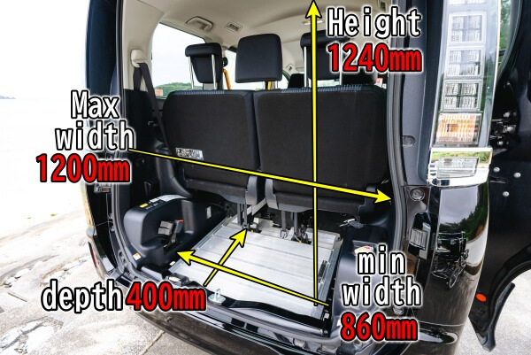 上記画像のスペースに高さ1240mm・横幅最大1200mm/860mm・奥行き400mmの範囲内でスーツケース等が積載できます