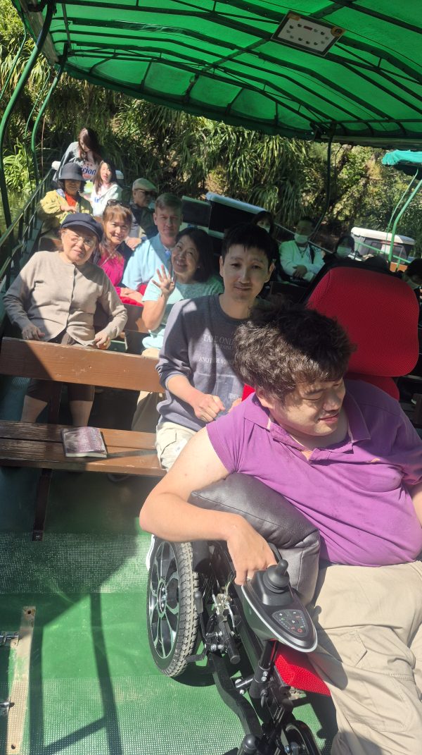 ビオスの丘名物・湖水観賞舟に乗る前にぬそーっと水牛車が目の前に。お客様はスロープで乗車できる様子を動画でご覧になっていたそうですが、現実としては車椅子乗降できません。