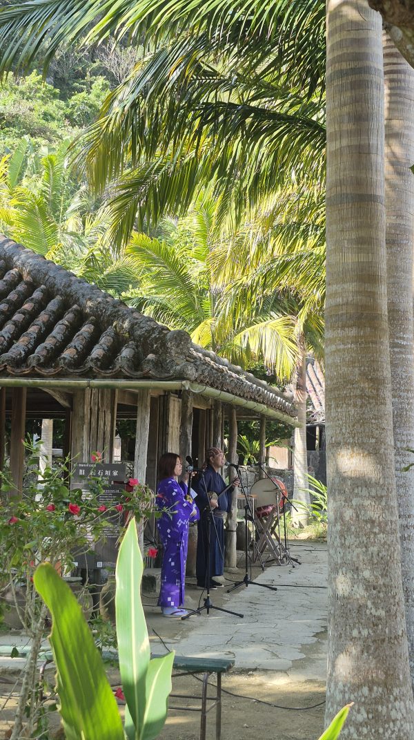 数回シャッターボタン押したらたまたまヤシの木が中央に位置してお二人の笑顔も素晴らしくて赤瓦と紅型衣装と青空のコントラストたるや!!!